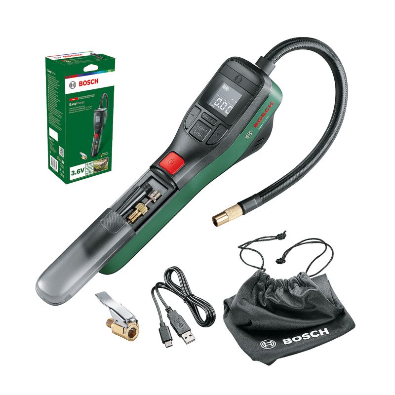 A BOSCH EasyPump é uma bomba de ar elétrica prática para uso em casa ou em trânsito. O pequeno compressor é alimentado pela bateria integrada, que carrega via USB-C.