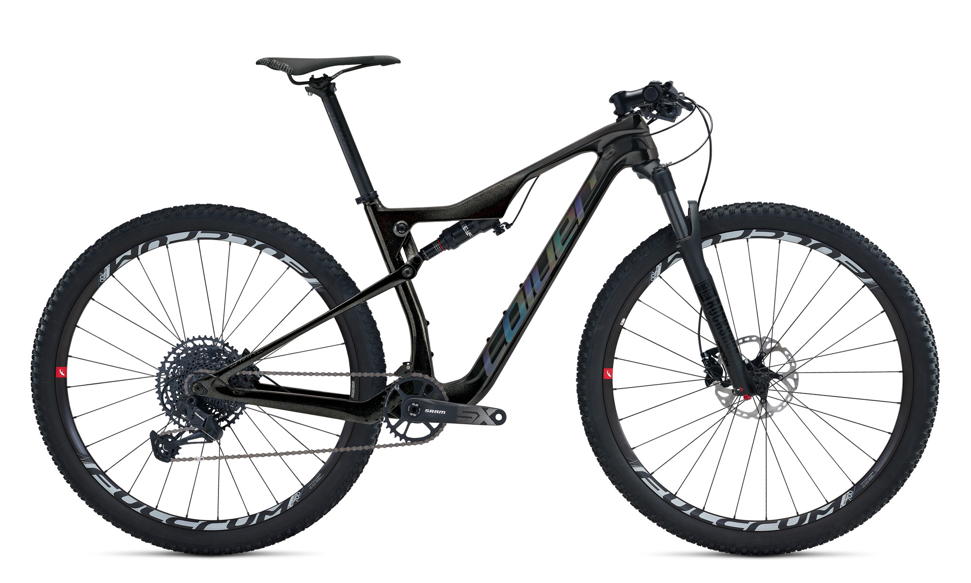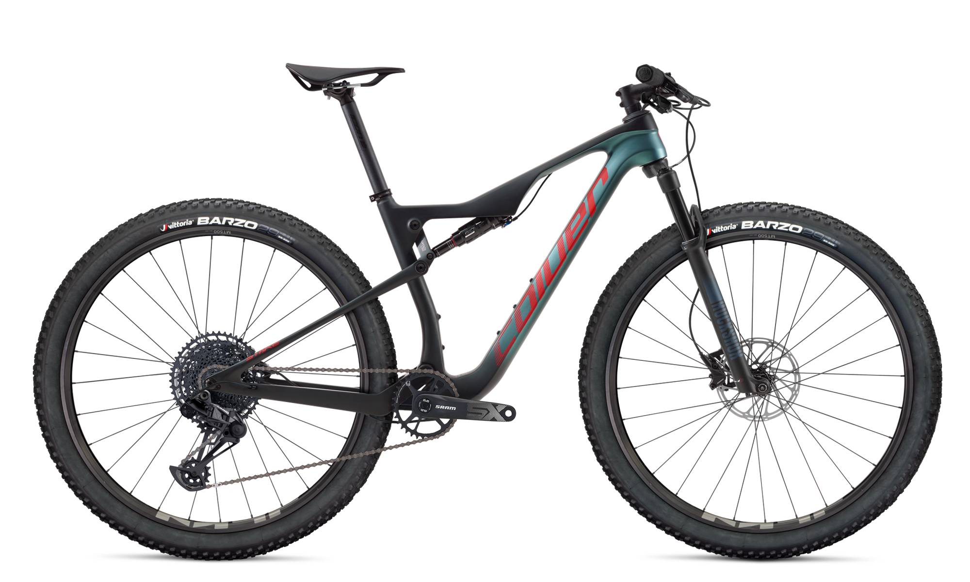 Carbono T-700/800 HMC com braço de Carbono Monopivot de 4-Pontos, curso de 100mm, Geometria XC Race, escoras monopeça anti-flexão, Sistema de Cabos Internos preparado para espigão telescópico, Movimento pedaleiro BB92, Direção cónica 1-1/8 – 1.5 e Sistema BOOST 12×148